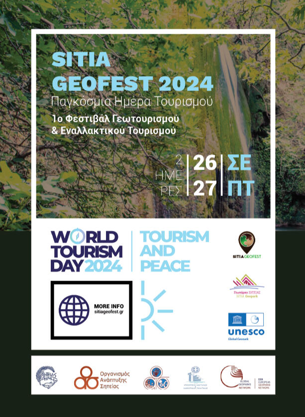 Διήμερο Εκδηλώσεων για την Παγκόσμια Ημέρα Τουρισμού στη Σητεία - Sitia GeoFest 2024Η Σητεία γιορτάζει την Παγκόσμια Ημέρα Τουρισμού με ένα μοναδικό διήμερο εκδηλώσεων στις 26 και 27 Σεπτεμβρίου 2024, εστιάζοντας στον Γεωτουρισμό και τις εναλλακτικές μορφές τουρισμού. Το Γεωπάρκο Σητείας και ο Δήμος Σητείας, με την υποστήριξη του ΟΑΣ και άλλων συνεργατών, διοργανώνουν το 1ο Φεστιβάλ Γεωτουρισμού και Εναλλακτικού Τουρισμού - Sitia GeoFest 2024.