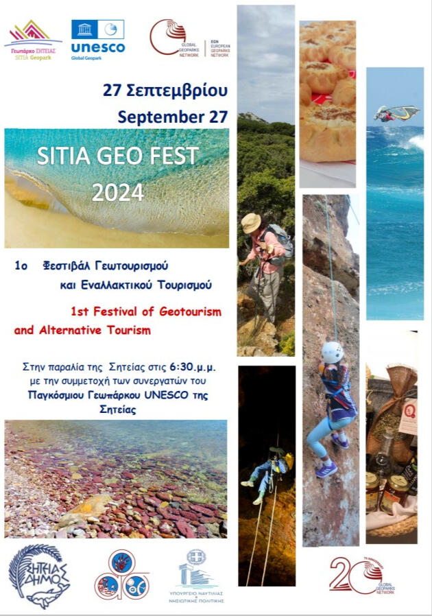 Το Sitia GeoFest 2024 αποτελεί μια μοναδική ευκαιρία για κατοίκους και επισκέπτες να γνωρίσουν τις τοπικές επιχειρήσεις, τους παραγωγούς και τους φορείς που συνεργάζονται με το Παγκόσμιο Γεωπάρκο UNESCO της Σητείας. Μέσω του Τοπικού Συμφώνου Ποιότητας, εξασφαλίζεται το υψηλό επίπεδο παροχής υπηρεσιών και προϊόντων, προωθώντας τη βιώσιμη τοπική ανάπτυξη.Ο Γεωτουρισμός, ως κεντρικός άξονας του φεστιβάλ, αναδεικνύει και ενισχύει την ταυτότητα της περιοχής, λαμβάνοντας υπόψη τη γεωλογία, το περιβάλλον, τον πολιτισμό, την αισθητική, την κληρονομιά και την ευημερία των τοπικών κοινωνιών.Σας προσκαλούμε σε αυτό το διήμερο να ανακαλύψετε μέρος των μοναδικών εμπειριών που προσφέρει το Παγκόσμιο Γεωπάρκο UNESCO Σητείας.