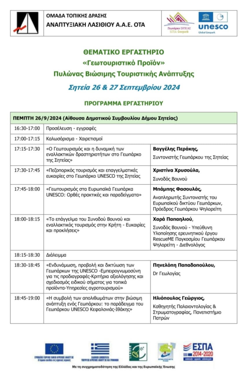 Το πρόγραμμα περιλαμβάνει:Πέμπτη, 26 Σεπτεμβρίου 2024:▶ 17:00 - Θεματικό εργαστήριο "Γεωτουριστικό Προϊόν: Πυλώνας Βιώσιμης Τουριστικής Ανάπτυξης" στην αίθουσα του Δημοτικού Συμβουλίου Σητείας. Δείτε το αναλυτικό πρόγραμμα ομιλιώνΠαρασκευή, 27 Σεπτεμβρίου 2024:▶ 10:30 - Ξενάγηση στα Αγγλικά στο Ιστορικό-Λαογραφικό Μουσείο Σητείας